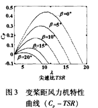由公式(1)得變槳距風(fēng)力特性曲線(Cp-TSR) 如圖3所示。從圖中可知槳葉節(jié)距角β增大,風(fēng)能利用系數(shù)Cp明顯減小,風(fēng)力機(jī)獲取的能量也相應(yīng)的減小。因此當(dāng)風(fēng)速超過(guò)額定風(fēng)速時(shí),通過(guò)增大節(jié)距角,使發(fā)電機(jī)輸出功率穩(wěn)定在額定功率上,減少風(fēng)速劇變對(duì)風(fēng)力機(jī)的沖擊;而當(dāng)風(fēng)速低于額定風(fēng)速時(shí),減小節(jié)距角,使槳葉處于最佳捕獲風(fēng)能的位置(一般為3 QUOTE 左右),發(fā)電機(jī)輸出最大的功率。